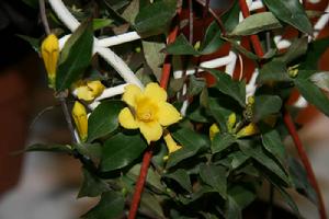 金鉤吻金鉤吻為攀援性灌木,適合攀爬於棚架、欄桿、鐵窗上,很快就能織出一幅綠色的窗紗。嫩莖綠色,成熟莖紅褐色,地下有粗壯的根莖;葉對生,披針形,表面有光澤,先端尖,背面稍淡;花單生或成小型聚傘花序,出自葉腋,花漏斗形,五裂,裂片圓形,先端稍凹,鮮黃色有香氣;果實為蒴果,2果瓣。