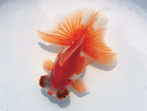 4、水泡眼:這種眼的眼眶與龍眼一樣大,但眼球卻同正常眼的一樣小,眼睛的外側有一半透明的大小泡,這種眼稱為水泡眼。還有一種與水泡眼相似,只是眼眶中半透明的水泡較小,在眼眶的腹部只形成一個小突起,從表面上看很像蛙的頭形,所以稱為蛙頭,也有人稱為蛤蟆頭。