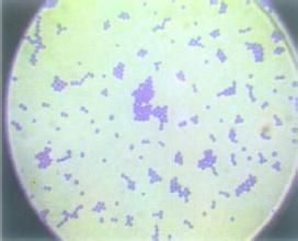 顯微鏡下觀察該菌為革蘭氏陽性球菌,排列成葡萄串狀,也有個別2個或3個球菌相連。根據菌落形態、鏡檢結果懷疑該菌為葡萄球菌。
