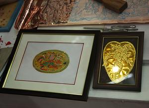 金碧輝煌的銅箔是佛山著名的手工業產品,用手工反覆摺疊錘打銅片而成,在經過火爐焗火煅燒,用烏梅汁及醋酸兩次酸洗,多次水洗,摺花、錘光等十多個工序製成。一般用7.5斤銅為一包,經加工達成9寸長、7寸寬的銅箔。如果是青銅品一包則有560餘張銅箔,如果是大光銅或縐金銅一包有1100餘張。質量好的銅箔,不會氧化變色。銅鑿剪紙作品珠光閃閃,富麗堂皇,氣氛熱烈。