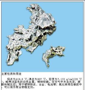 鋅粒鋅是一種藍白色金屬。當溫度達到225℃後,鋅氧化激烈。燃燒時,發出藍綠色火焰。鋅易溶於酸,也易從溶液中置換金、銀、銅等。鋅在自然界中,多以硫化物狀態存在。主要含鋅礦物是閃鋅礦。也有少量氧化礦,如菱鋅礦,如菱鋅礦和異極礦。