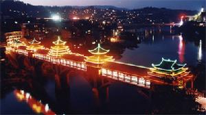 夜幕降臨橋上彩燈放亮,閃射出赤橙黃綠青蘭紫之光芒,一層層疊檐在閃亮,一道道橋脊在流動,一個個翹角在閃爍,一串串葫蘆在眨眼。龍鳳呈祥,紫氣東來,波光映彩虹,清流河中,仿如婀娜多姿的侗家仙姑把你帶進天上人間。