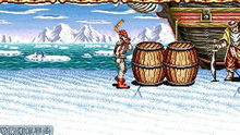 第二關(巨人):剛被一大籠子放下時別站他太近小心被他掄到!通用的方法是拿一石頭站在射逞內等他下來就砸他!(((還有就是在這關先前有一馬蜂窩你有能力的話可以攢到見關口...然後抓住時機仍向他打對地方可以費很多血的!我用的不好偶爾才能成功所以也說不清楚...)))等他起來時記住還是別站他身邊.然後從上或下走進他身邊抓住他.這時別把他仍了啊.要按跳!!!!(別說我瘋了,...)跳的同時按方向鍵向右.然後你會和他一起到了頻幕的最右方然後不按方向只打他4下再然後按右再加跳這時你又抓住他了.然後再只打4下再重複以上動作...一直重複只到打到他舉石頭的時候..........