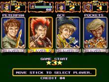 遊戲中共有五個角色可選:老大彼得潘--PETERPAN、老二雙刀--RUFIO、老三企鵝小子--ACE、老四娃娃--POCKETS、老五胖子--THUDBUTT。其中數老大、老四、老五較為厲害一些,較多人選。老大