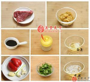 6、將牛肉片與調料攪拌均勻,至少醃製15分鐘。醃製的時候,把蔥姜切絲,蒜瓣切片,紅椒切絲