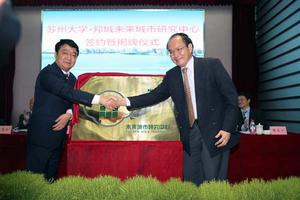 蘇州大學·邦城未來城市研究中心簽約2012年9月14日下午,由蘇州大學與邦城規劃顧問公司(SCP)聯合成立的未來城市研究中心(以下簡稱“研究中心”)簽約暨揭牌儀式在蘇州大學隆重舉行。原新加坡貿工部和教育部政務部長、蘇州工業園區開發公司首任總裁曾士生,蘇州大學黨委書記王卓君,常務副校長田曉明,邦城規劃資深高級顧問、中國區主席符基仕,執行董事廖金源,中國區總裁陳啟寧,前澳大利亞新南威爾斯大學、西悉尼大學前副校長、前悉尼大學規劃系主任伍宗唐教授,新加坡南洋理工大學楊建偉教授等出席了本次儀式。