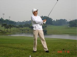 陳道明揮桿高爾夫球場陳道明身穿一套雪白的運動裝,頭戴一頂白色的鴨舌帽,來到了高爾夫球場。工作人員幫他從車上取下了全套的高爾夫球具。陳道明徑直走進了練習場,開始練起了揮桿。他的動作瀟灑嫻熟,每次擊球準確有力,球劃出漂亮的弧線飛出去很遠,看上去就像一個專業的高爾夫球選手。陳道明從兩年前就開始喜歡上高爾夫運動,一有時間就參加圈內組織的打球活動,他很聰明,學得也很快,2007年搬進新別墅後,因為旁邊就是高爾夫俱樂部,因此更是“近水樓台先得月”,經常前來練習,水平提高得很快。剛開始他學打高爾夫球時,球經常被打得四處亂飛,現在陳道明的水平與當初相比已不可同日而語。