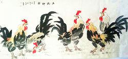 王世軍國畫《雞之五德》雞形象已經被神化。雞雖然不等於太陽,但是雞是 太陽的使者或 傳令者。於是,就有陶雞、雞形壺和青銅"金雞"等,有的可能本身已經被神化,有的早被看作是神的使者或助手。這裡說的"神",首先是太陽神和火神。不是祭祀品而是祭祀對象的雞,地位當然要高一些。可以說,此時的雞已經步步登上了神壇。數千年來,雞留下了許多美好的神話傳說、文藝作品,也留下了不少與雞有關的歷史故事,為中國的傳統文化增添了豐富多彩的內容。古代的社會生活中,雞還是生殖崇拜的符號之一。而且,除了祭祀之外,雞在盟詛活動中也必不可少。歃血為盟用雞,古代帝王大赦天下有時也採取“ 金雞赦”的形式。以金雞設於高午之上,表示赦宥。雞有司晨作用,又有禮儀功能,是雞受到古人重視的重要原因。更為實際的是,養雞為人們提供了重要的肉、蛋食源。雞的個體雖小,但生產能力很大,它生長迅速,周期短,投入成本低。古人雖鮮有大規模經營的養雞業,但作為家庭副業,三五成群養雞的情況卻十分普遍。在漫長的歲月中,人們培養出了很多優良的雞品種,其中肉用品種和肉卵兼用品種多產於中國東部地區,如上海浦東雞、江蘇狼山雞、遼寧大骨雞、山東壽光雞、浙江蕭山雞等。品種優良的雞更是適於做佳肴的原料。早在漢代,就已經有了美味中的地方名牌產品--符離雞。在徐州獅子山漢代楚王墓里象徵廚房的耳室中,出土了很多雞骨,其間還有一方泥,上有"符離丞印"字樣。看來當時符離縣為這位漢代的楚王送來了不少符離雞貢品。時至今日,符離燒雞仍然是享有盛譽的地方特色食品。它的淵源可以追溯到漢代。