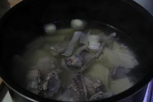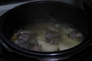 3.雞骨架、乾豆腐,放入電飯煲或者電壓力鍋,倒入沒過骨架和乾豆腐的開水(一定要開水),加入料酒、花椒汁、蔥段兒和薑片,然後選擇煲湯檔,煲上1-2小時。煲湯的時候將打算搗成蒜泥備用 | ![]() |