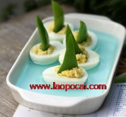 2雞蛋在冷水中浸一下,剝殼,再切成橫向對切;