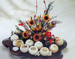 3、羊肚菌、雞樅菌、冷菌、松茸洗淨,置入小石盅內,加龍筋、駝鳥筋、鹿筋,澆入雞湯,上籠蒸製20分鐘,裝盤,點綴盤飾即成。