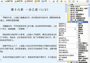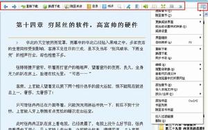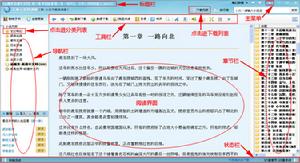 閱讀界面位於主界面的中間,上面是便捷工具列按鈕,最右邊是全面的功能下拉選單(閱讀界面的右鍵選單中有部分這些功能):