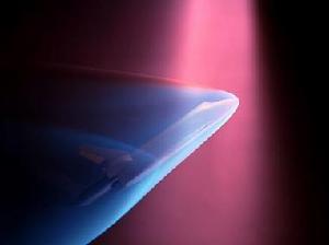 在一次美國國家航空航天局的風洞試驗中,電子束射向太空梭的迷你模型,模擬返回大氣層時,太空梭四周的游離氣體。