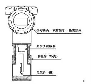 力,其作用力的大小與介質流速的平方成正比。阻流件(靶片)接受的作用力F,經剛性連線的傳遞件(測桿)傳至電容力感測器,電容力感測器產生電壓信號輸出。