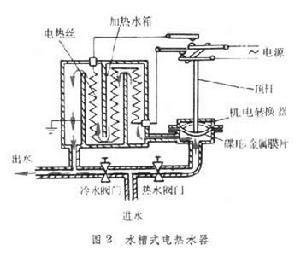 電熱水器②貯水式。利用電熱元件將貯水箱中的冷水加熱。容量較大,主要由內膽、電熱元件、溫度控制元件和壓力保護裝置等部分組成。電熱元件多採用金屬管式,溫度控制元件常用熱雙金屬片或感溫包式控溫器(又稱毛細管型控溫器),壓力保護通過壓力安全閥來實現。