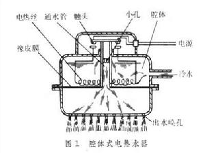 ①快熱式。又稱即熱式、流水式。冷水直接流經電熱元件表面而被加熱,停止進水就停止加熱。有腔體式(圖1)和水槽式(圖2)兩種。腔體式主要依靠橡皮膜的彈力來接通或切斷電源。冷水進入腔體後,借水流壓力和重力使橡皮膜下凹,帶動觸頭使電路接通,熱水經通水管的小孔流入通水管內;無水進入時,依靠橡皮膜的彈力使觸點斷開,電路即被切斷。水槽式則依靠機電轉換器來接通或切斷電源。打開熱水閥門時,水流衝擊機電轉換器中的碟形金屬膜片,推動頂桿上升,使電路接通;無水進入時,碟形金屬膜片靠彈性恢復到原始位置而使電源斷開。