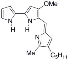 靈菌紅素結構式雖然其對於生產者的作用和意義還不是徹底明了,但現在它已被發現具有多種生物活性作用,能抗癌,抗微生物,抗瘧疾,抗霉,免疫抑制的作用。其中抗癌方面,因為其具有癌組織的高針對性和對正常細胞則表現的低毒害作用,而成為一種非常有潛力的抗癌物質。