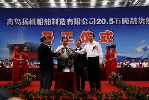 2011年6月28日,青島揚帆船舶製造有限公司在女島造船基地舉行20.5萬噸散裝貨船建造開工儀式。20.5萬噸散貨船是公司成立以來承接和開建系列大型散貨船,標誌著企業由建設期進入全面投產運營階段,步入了快速發展的軌道。此次建造的20.5萬噸散貨船是由青島揚帆船舶製造有限公司與上海船舶研究設計院聯合