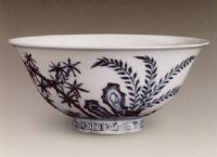 說 明: 胎質細膩,體輕釉白,採用進口“蘇麻離青”料繪製,色彩濃艷.碗雖無款,但紋飾布局、運筆瀟灑之畫風均為永樂時的突出特徵。此期所用青料,以蘇勃泥青為主,多見“鐵鏽斑痕”。出現了一些僧帽壺、綬帶扁壺、花澆等非漢文化的器型,反映了這一時期與外域、外族的文化交流與融合。紋飾多見各種纏枝或折枝花果、龍鳳、海水、海怪、游魚等。胎質較以前細膩緻密。釉質肥潤,多見橘皮紋。宣德青花數量大、品種多、影響廣,故有“青花首推宣德”之說。