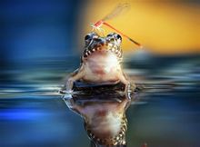 它的眼睛鼓鼓的,頭部呈三角形,加上爬行動作很遲鈍,也許你會以為它有點傻乎乎的。可是,當你稍一走近,就猛地一跳,跳到那飄著浮萍的池塘里。這一跳,足足有它體長的20倍距離。然後,以最標準的蛙泳姿勢,向對岸游過去。
