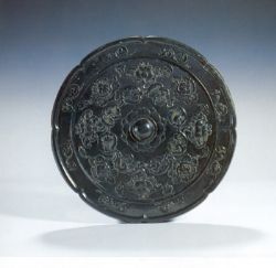 青銅鴛鴦臥蓮鏡,葵花形,圓形鈕,四周有八組蓮紋,其中有四組在蓮篷上各臥鴛鴦一對,與另四組含苞欲方的蓮蕾相間而飾。其間以蓮紋補白。鏡緣亦飾蓮紋。