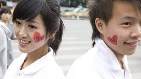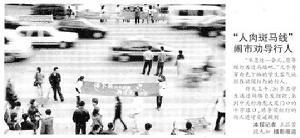 他們臉上塗著“飈愛”字樣的油彩,身穿印有“飈愛”紅心圖案的T恤。一旦人行橫道的紅燈亮起,他們就手挽手組成“愛心人肉斑馬線”,用陽光的微笑和善意的勸導,讓許多原本想闖紅燈的行人停下腳步。這種類似行為藝術的公益行動,讓這段路的通行效率明顯提高。