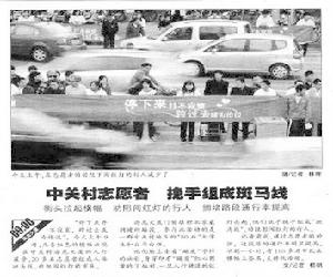 11月5日下午放學時段,十多名身穿“飈愛”紅心T恤的80後志願者,在北大附小東門斑馬線兩端手拉手一字排開。他們拉起橫幅,提醒過往司機停車,等待孩子們過馬路。