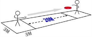 場地是兩個12M的正方形,中間距離15M,比賽的兩位選手,彼此相互投擲飛盤,如同網球比賽一般.