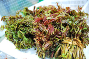 香椿芽在合適的溫度條件下(白天18℃~24℃、晚上12℃~14℃),生長快,呈紫紅色,香味濃。溫室加蓋草苫後40~50天,當香椿芽長到15~20厘米,而且著色良好時開始採收。第一茬椿芽要摘取叢生在芽薹上的頂芽,採摘時要稍留芽薹而把頂芽採下,讓留下的芽薹基部繼續分生葉片。採收宜在早晚進行。溫室里香椿芽每隔7~10天可采1次,共采4~5次,每次采芽後要追肥澆水。