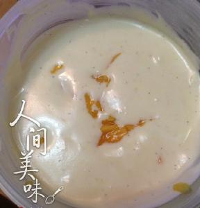 5.打發好的奶油分兩次放蛋黃液中,攪拌均勻。再放入芒果粒攪拌。 | ![]() |