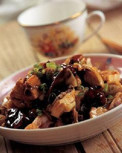 3.將食用油燒熱,放入雞塊,爆炒約4分鐘,烹入料酒,放入乾辣椒、姜、豆瓣醬、蒜炒透,