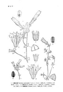 | Gentiana L. 龍膽屬,龍膽科,約500種,廣布於溫帶地區和熱帶高山上,我國有230種以上,各地均產之,但主產地為西南部,大部供觀賞用,有些入藥,如龍膽G.scabra Bunge有瀉肝膽實火,除下焦濕熱之功。 |