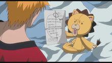 一護從尸魂界歸來那天,魂發現露琪亞並沒有跟著回來,於是沖一護髮火,但被一護用死神代理證變回藥丸形態 。隔天晚上,恢復成布偶形態、由雨龍做好了修補的魂,正在一護房間裡發著脾氣。由於有虛出現,魂又作為替身進入了一護的肉體 。認為機會難得的它,沒有聽從一護“不要亂來”的吩咐,偷偷跑到街上閒逛,結果被準備找一護報仇的GRAND FISHER發現並遭到攻擊。魂拚命逃跑,無奈敵人的速度比它更快,就在魂將要被殺死時,死神形態的黑崎一心及時出現救了它。原來一心早就知道魂的事情,而讓魂更為驚訝的是,平時看起來像個白痴老爸的一心原來非常厲害,一擊就打敗了敵人 。敵人被消滅後,浦原喜助也到達現場 ,魂被警告不能將這晚看到的事情告訴別人。