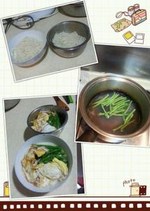 3.麵條煮好後先撈出來放到碗裡待用。接著煮蔬菜,我今天用的是豆角,所以呢要煮的時間長一點。如果是普通的生菜或者是菜心一兩分鐘就夠了。青菜煮好之後雞蛋湯也好了,把青菜和雞蛋塊撈出來放在麵條上面,再放一兩滴鮑魚汁。最後把湯澆到麵條上面,這個湯麵就做好了! | ![]() |