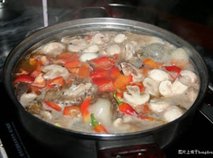 活鯉魚1條(四斤),白蘑菇1斤。配料〗姜,大蒜,紅菜椒,辣椒。