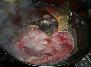 步驟4:煎五分鐘魚,這樣才令魚湯雪白。燒滾少許油,再把整條魚放下鍋中慢慢煎,一邊煎一邊再放些油入鍋,本人是用電磁爐煎的,火侯一定要注意,要時不時的動動鍋不然易把魚煎糊,建議用明火(煤氣灶)煎,易掌握火候。
