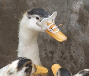 在鴨子25天左右開始換羽時,佩戴鴨眼鏡直到上市出售。