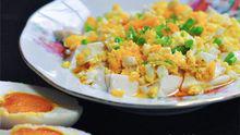 將內脂豆腐切成1.5厘米見方的丁,用沸水燙泡後瀝乾,少許薑末煸香,放適量鮮湯燒開,下豆腐及蒸熟搗碎的紅心鹹蛋黃。加鹽、味素調味後勾芡,撒蔥花,淋熟油即成。此菜豆腐潔白如玉,蟹黃紅似瑪瑙,滑嫩鮮香,非常可口。