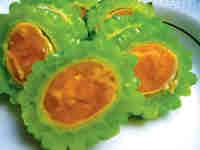 鹹蛋苦瓜原 料:主料:苦瓜250克,熟鹹蛋100克輔料:植物油30克,蔥10克,精鹽2克。特點: 色澤明亮,別有味道。