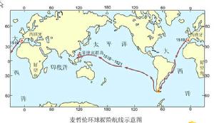 麥哲倫大致航海路線:從歐洲出發經大西洋過麥哲倫海峽,過太平洋,經印度洋,過好望角,最後通過大西洋回到歐洲。其中經過的南美大陸南端的海峽後來命名為麥哲倫海峽,以紀念麥哲倫在人類航海史上作出的巨大貢獻。
