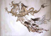 黃帝乘龍升天圖黃帝的晚年,發明了鼎。當第一個鼎被鑄造出來時,天上突然飛下來一條龍,那條龍有著威武的眼睛和長長的、閃著銀光的龍鬚,整個龍身透著金光,降臨時好像帶來萬匹的金鍛,籠罩了整個天空。