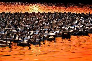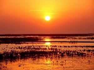 故道入海口,濁浪和碧浪伴著晚霞跳躍,漸漸吞沒一輪夕陽,這就是故道的落日。故道落日實則是水中觀日。尤其在晴空之日,萬頃碧水泛著細浪,水中太陽搖曳多姿,或兩輪或三輪,不斷變化,繼而形成一個巨大的火圓柱。這時,伴著水中張張漁網,映著天空夜歸候鳥的倩影,和著鶴類高亢的鳴叫聲,組成了一幅美妙的畫面。
