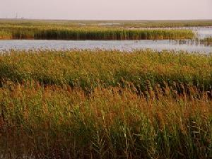 在低洼積水區,蘆葦形成優勢種群,季節變化明顯。春風吹來,蘆葦吐綠,片片滴翠,碧波蕩漾;金秋時節,乳白的葦穗在晨曦中搖曳,仿佛成群結隊的羊群,一望無際;進入深秋,蘆花飄揚,伴著瑟瑟荻花,象輕盈的白雪隨風飄蕩,情趣萬千,萬頃草場上再現“天蒼蒼,野茫茫,風吹草低見牛羊”的草原風光。連綿不斷的蘆葦盪,粗狂豪放,給人以大自然返璞歸真之感覺。各種鳥類的起落,給蘆葦盪帶來了無限的生機,更給遊人增添無限的樂趣。