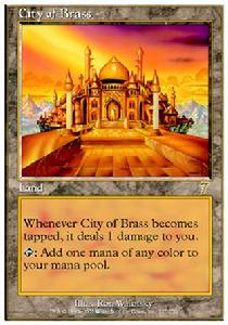 地 (0)每當黃銅之都橫置時,它對你造成1點傷害。 T:加一點任意顏色的法術力到你的法術力池。