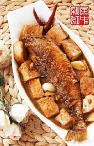 黃魚2條、豆腐200克、蔥、姜、蒜適量、乾紅辣椒4~5根、澱粉少許、料酒、醬油、醋適量、鹽、白糖少許。