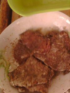 1.將肉切厚片,用肉錘均勻的把肉的兩面錘松,用料酒,鹽,香葉,胡椒粉,澱粉醃一個小時(我做的時候醃了一下午) | ![]() |