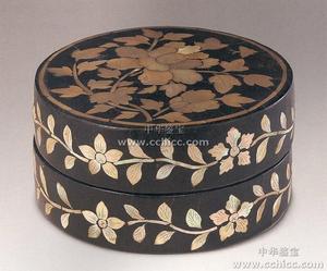 基本信息明晚期,高6.6厘米口徑11.5厘米,清宮舊藏文物特徵盒通體髹黑漆,用厚螺鈿片嵌花卉圖案。蓋面上嵌一株牡丹花卉及飛蝶一隻,蓋壁及器壁均嵌纏枝花卉紋。盒內及底髹黑漆,無款。此盒製作規整,所嵌螺鈿五光十色,斑斕絢麗,是明晚期嵌螺鈿漆器之精品。
