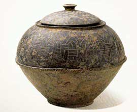 黑陶竹編紋帶蓋罐,在崧澤遺址出土。盛貯器。是崧澤文化陶罐的珍品。