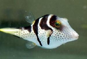 也叫日本婆。屬於扁背魨屬的一個品種。身體為明亮多彩的顏色,上半部分為黑褐色斑帶,下半部分帶橘褐色斑點,黃色的鰭。缺少腹鰭,但在水族箱中遊動自由。150升純魚缸飼養。會和箱魨、背鰭很大的魚及其他魨類打仗。有時候會很兇猛,啃咬缸里其他魚的鰭,留下它的標記—一個牙圈。在珊瑚缸中會吃掉無脊椎動物。牙齒類似鳥喙結構。有一些區域的肉是有毒的。如果用網撈會受到驚嚇,而膨脹身體保護自己。因此,最好用容器撈取。需要各種動物性餌料,包括:魷魚、磷蝦、蛤類及硬殼蝦幫助其磨磨不斷生長的牙齒。