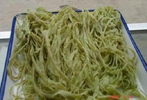 龔灘綠豆粉烙綠豆粉通常是在家裡的灶台上進行。灶上的大鍋直徑約有一米,坐在灶前將柴草慢悠悠丟進大大的灶孔里,灶邊的木凳上放著大盆剛磨好的漿,女人套著袖籠,繫著圍裙,沉心靜氣,先將大鐵鍋塗滿菜油,在漏眼細細的漏斗里盛滿米漿,然後以鍋為紙,以漿為墨,女人晃動著手臂,自大鐵鍋的最里圈開始,飛快地鏇轉著畫著近乎同心的圓,一圈一圈向鐵鍋的邊緣擴展。那毛線般粗細的冬粉圍成的一個一個的圓圈井然有序,絕不交叉,絕不重複,一鍋約有近百圈,鏇到臨近鍋邊時,漏斗里的漿也剛好滴完。女人握著漏斗的手熟練地一頓,最後一滴漿點成一個小圓點,像一個休止符。女人的架勢就像樂隊指揮在演奏結束的收尾動作,果斷而乾淨。然後,女人把木製的大鍋蓋蓋在鐵鍋上,燜上大約半分鐘,綠豆粉就熟了。揭開鍋蓋,綠豆粉熱騰騰地散發著清香。女人用竹刷把輕輕一撩,絲絲縷縷的綠豆粉被捲起來扔進大竹筲箕里。烙是綠豆粉製作的一項重要工序。